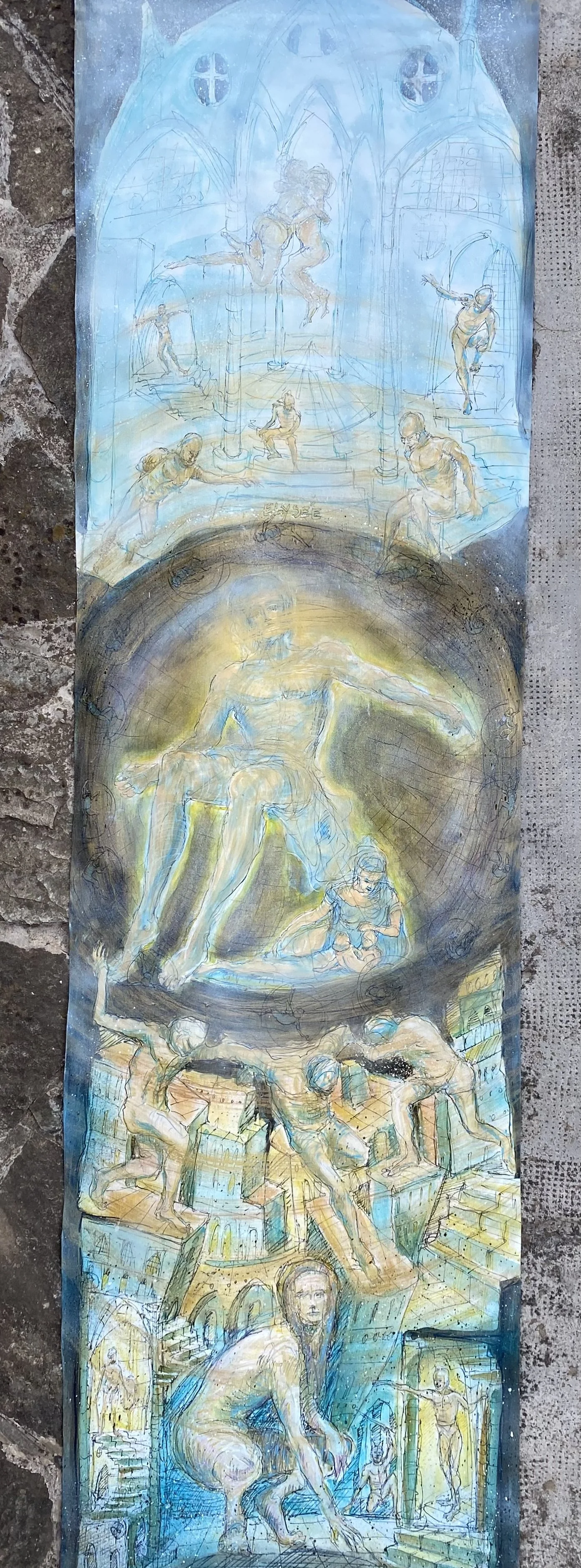 Au delà de cette iconographie traditionnelle, l'idée de Jean Monestié est de faire échapper ses personnages de leurs conditions de simples terriens. Dans ces espaces en apesanteur, chacun doit trouver sa place.